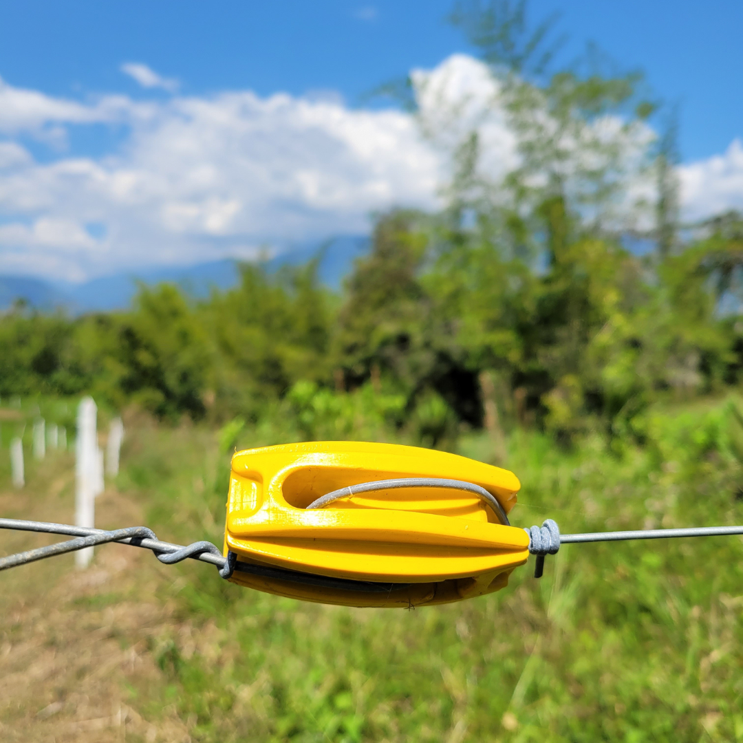 Es instalado al inicio, al final y/o en cada cambio de dirección de la cerca, cumple la función de aislar la corriente de los estacones de madera, acero, etc.