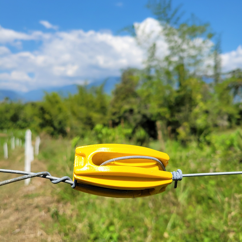 Es instalado principio a fin de cada tramo de las cercas eléctricas aislando la corriente del estacón guía.